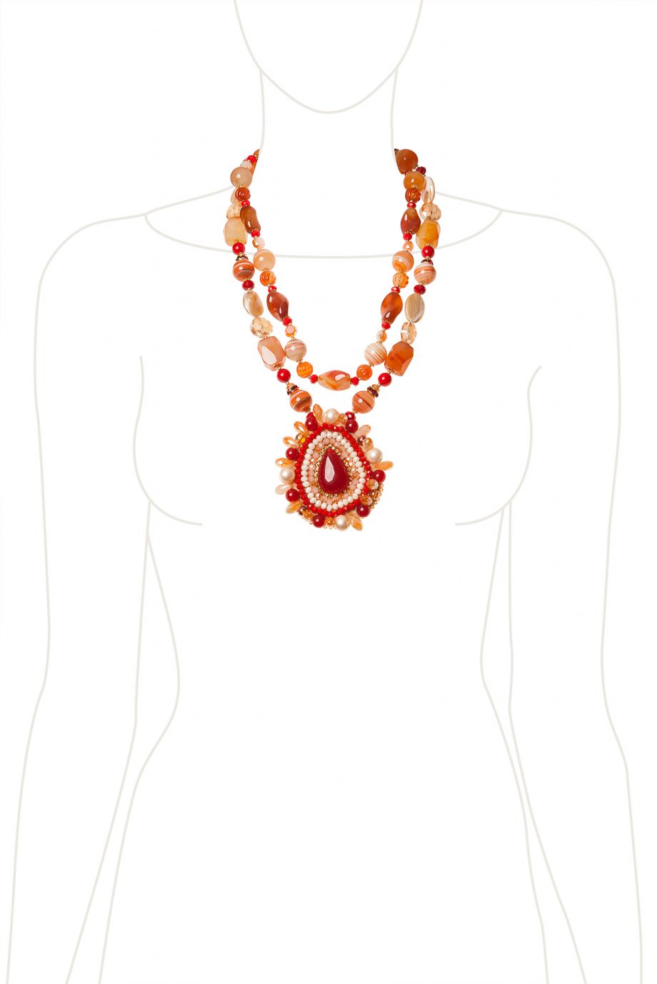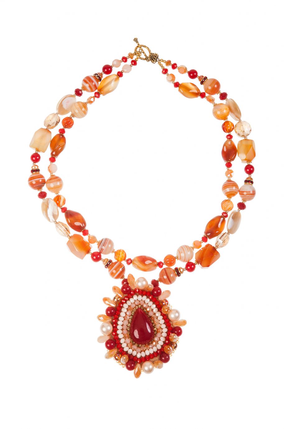 Красно-оранжевые сердолик и халцедон играют на контрасте с белоснежным перламутром.